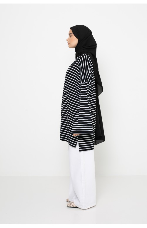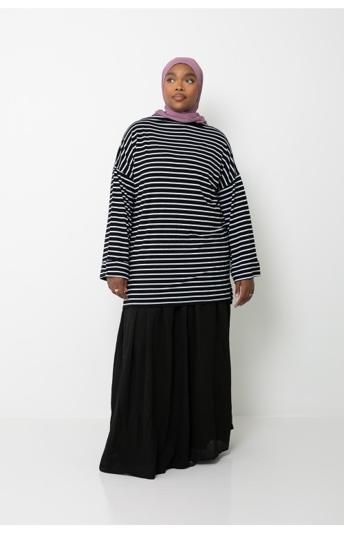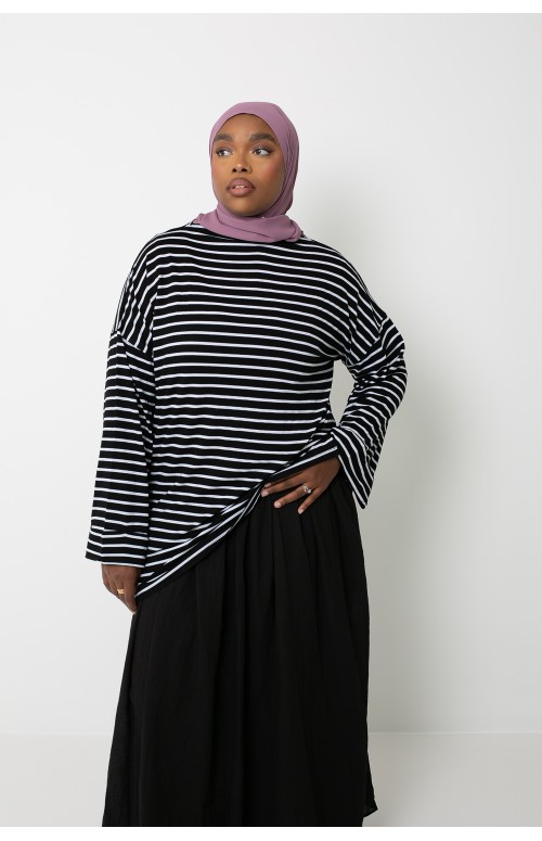 Regálate un toque de frescura y elegancia con nuestra camiseta marinera holgada de manga larga. Confeccionada en viscosa fluida, este icónico diseño combina comodidad, modernidad y calidad. Su discreto y cómodo escote barco se adapta perfectamente a un hiyab y añade un toque de distinción a tu look.