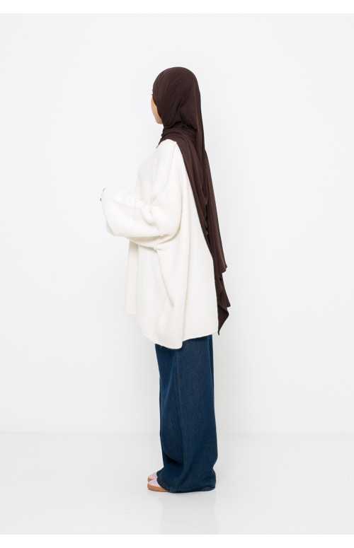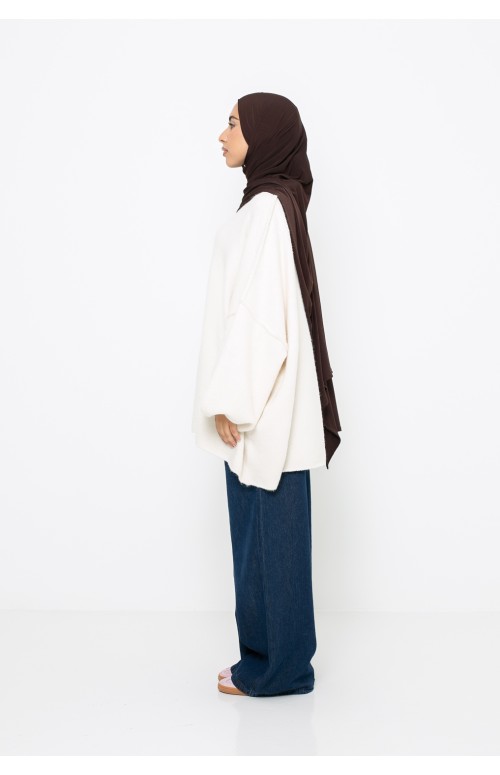 Descubre el jersey oversize en blanco roto que combina comodidad y estilo atemporal. Diseñado en un material suave y agradable al tacto, envuelve delicadamente la piel para un placer de uso diario .
