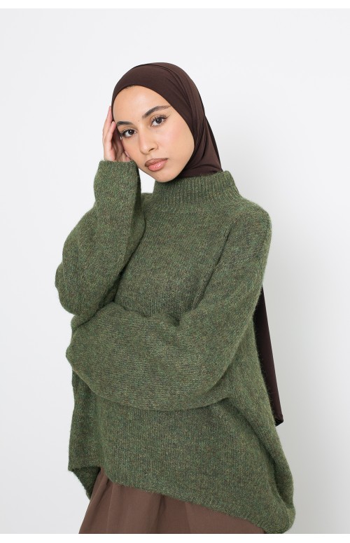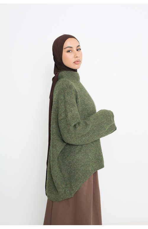 Ponte este jersey de punto oversize en tejido cálido y suave, ideal para la temporada de frío. Su corte holgado garantiza una comodidad absoluta, mientras que su diseño asimétrico le da un toque moderno y actual: la parte delantera es ligeramente más corta que la trasera para un efecto elegante y relajado. Cuello alto.