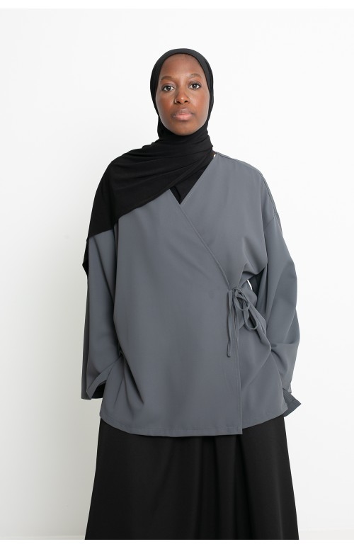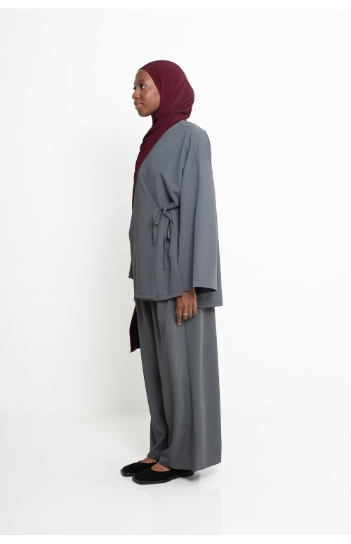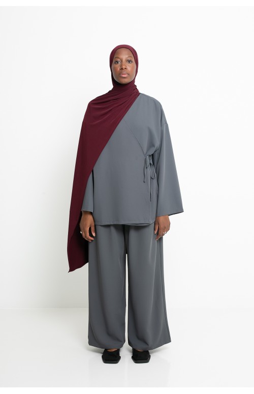 Optamos por un atuendo elegante y sofisticado. Para lograrlo, lo combinamos con pantalones grises de sastre, un hiyab de jersey premium color burdeos y unos zapatos color burdeos.
