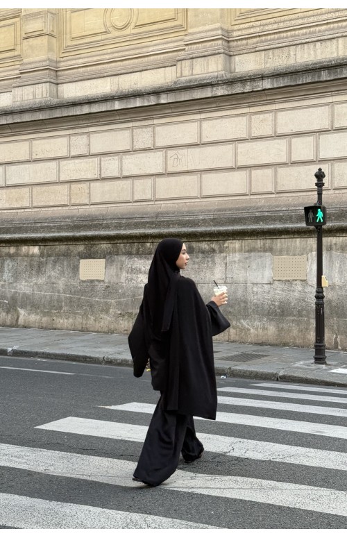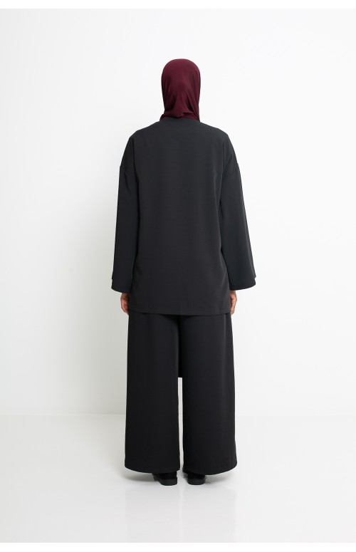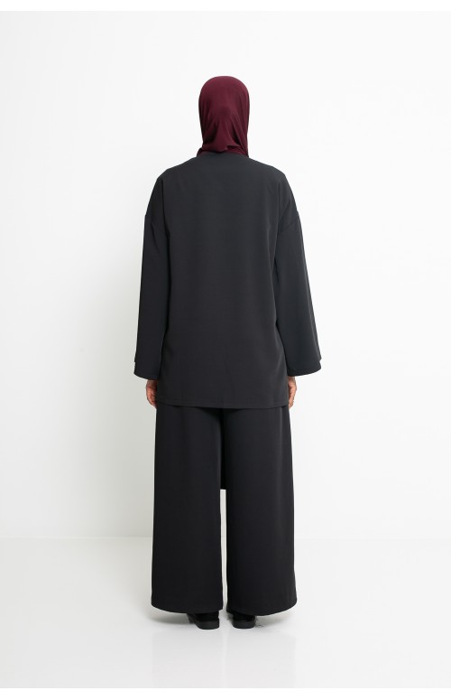 Optamos por un atuendo elegante y sofisticado. Para lograrlo, lo combinamos con pantalones grises de sastre, un hiyab de jersey premium color burdeos y unos zapatos color burdeos.