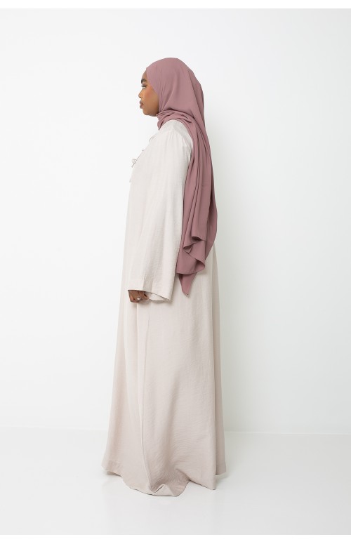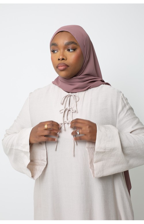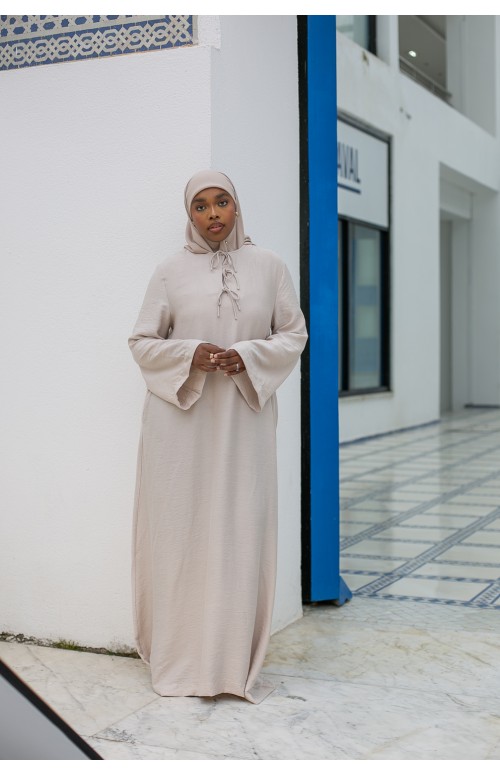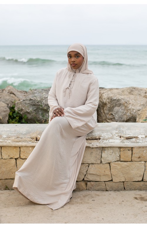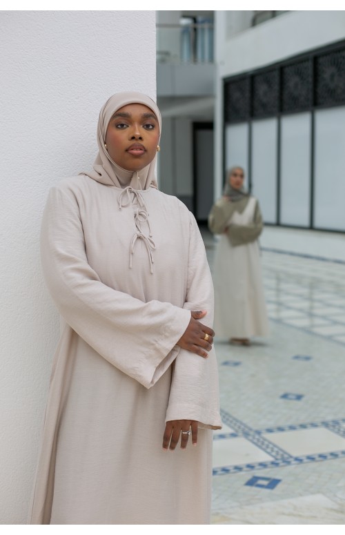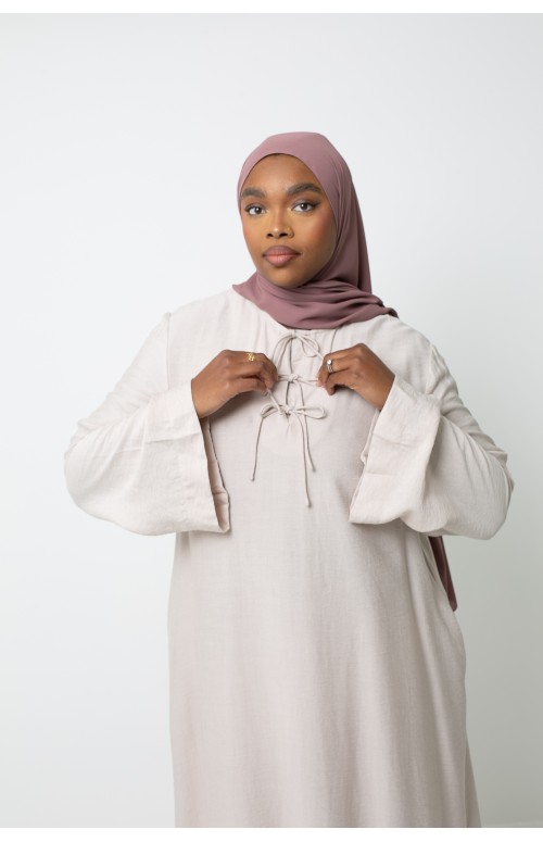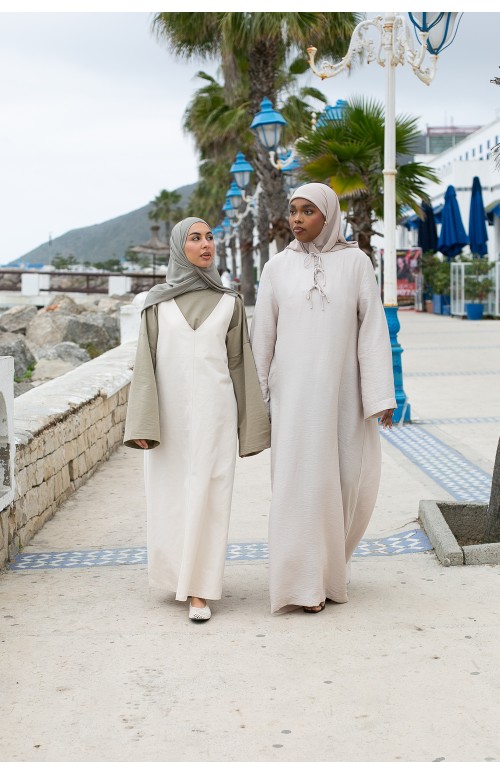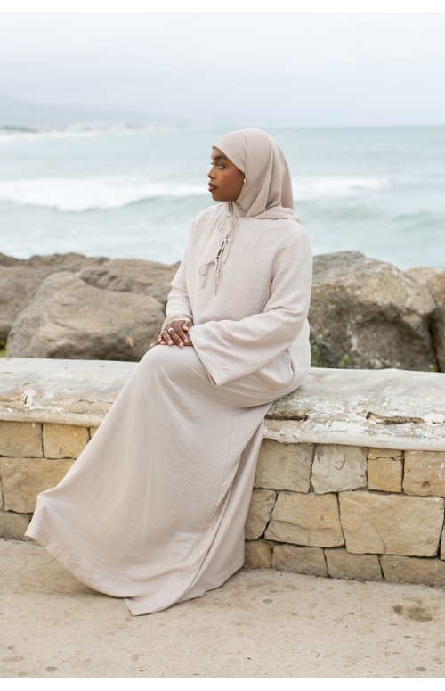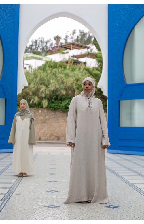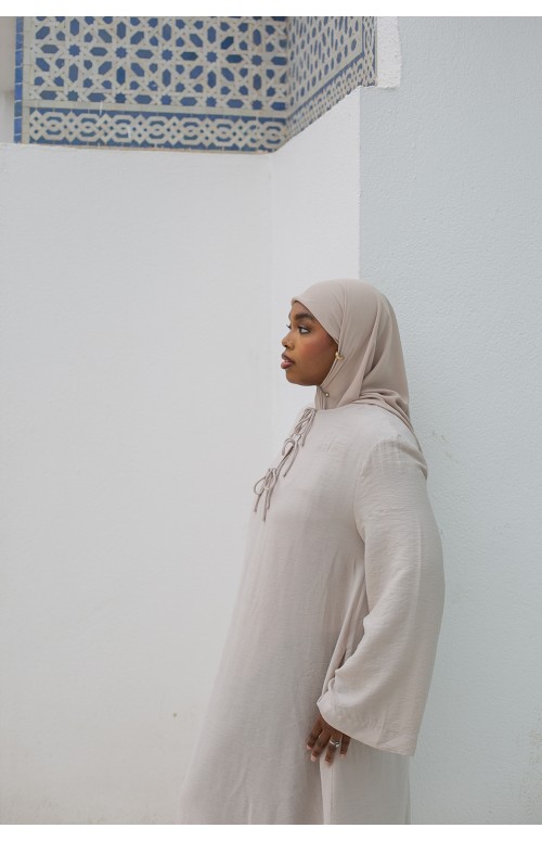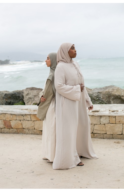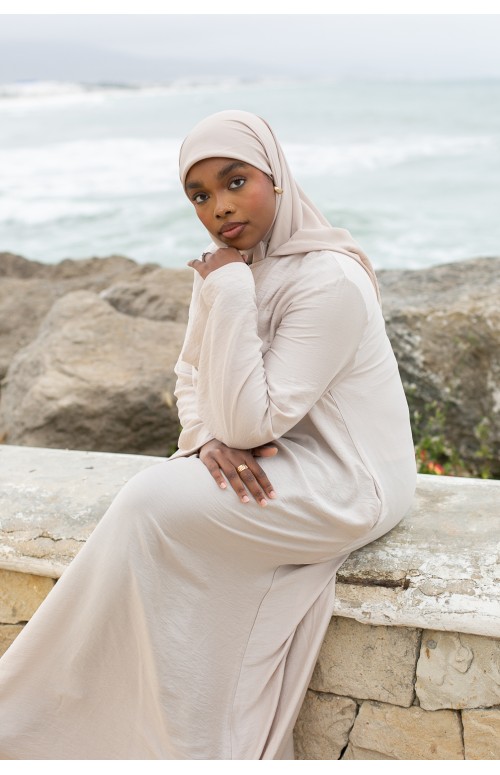 La modelo mide 1m71 y usa una talla M/L. Zaharia lleva tacones y un lujoso hijab de gasa color siena.