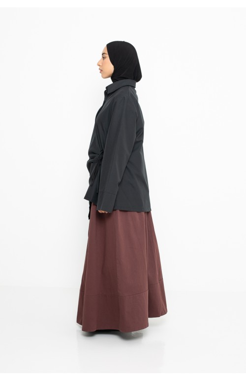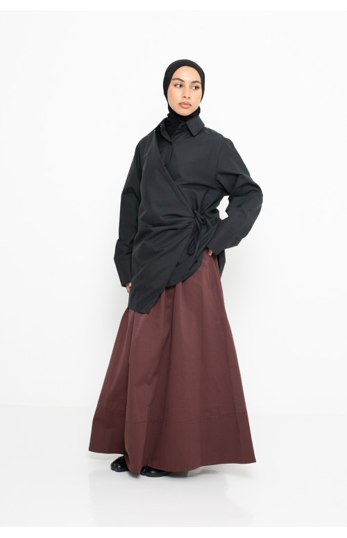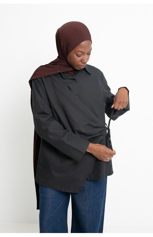 Une chemise à nouer asymétrique et élégante, avec des plis raffinés et des boutons ton sur ton. En tissu haut de gamme durable, elle s’associe parfaitement avec une jupe et un hijab pour un style raffiné. Création CM.