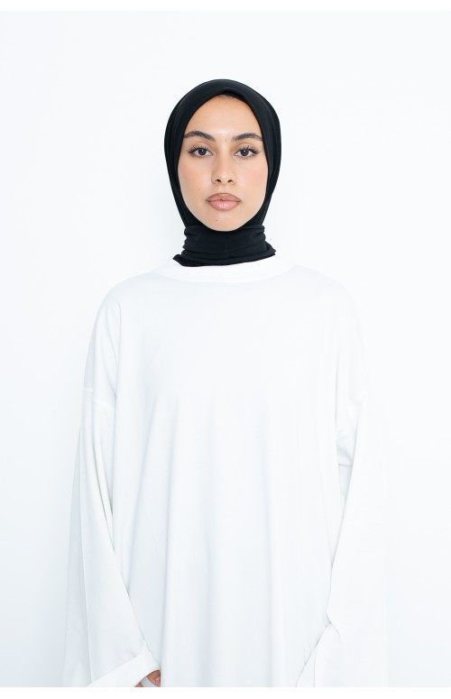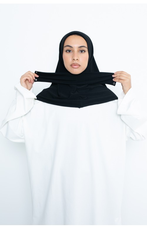 Hijab prêt à enfiler, il vous suffit de fermer les pressions à l'arrière. Idéal pour votre quotidien mais aussi pour le sport et même pour la piscine car le tissu sèche très rapidement.