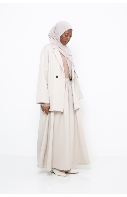 Nous l’avons porté avec le hijab jersey premium grège et une paire de chaussure nude.