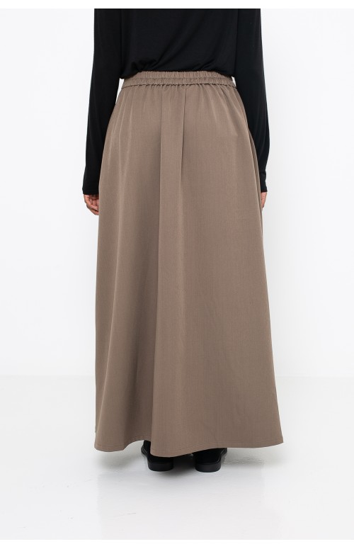 Cette jupe longue a été travaillée avec soin pour allier style et confort. Sa taille élastique uniquement à l’arrière permet une adaptation parfaite à la morphologie tout en gardant une allure chic et structurée à l’avant. De délicats plis plats sur le devant apportent originalité et modernité, créant une silhouette élégante et sophistiquée.