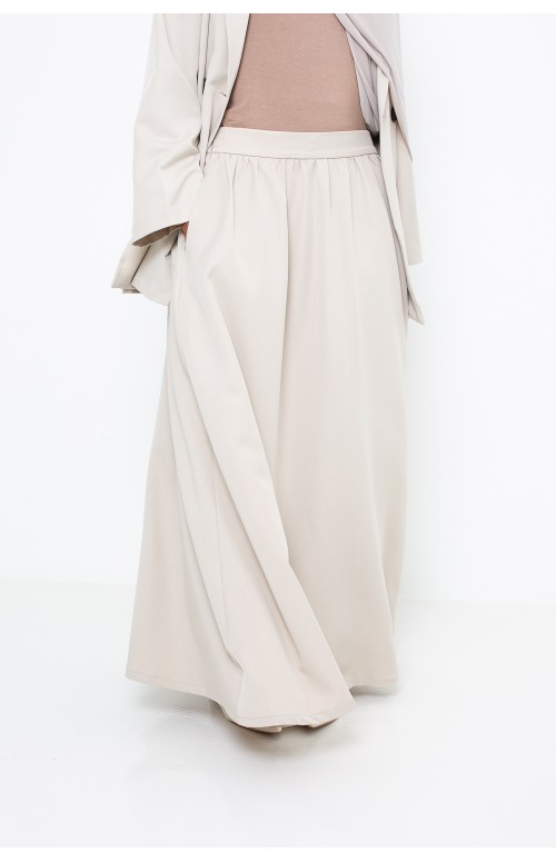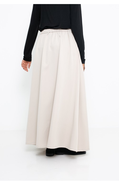 Cette jupe longue a été travaillée avec soin pour allier style et confort. Sa taille élastique uniquement à l’arrière permet une adaptation parfaite à la morphologie tout en gardant une allure chic et structurée à l’avant. De délicats plis plats sur le devant apportent originalité et modernité, créant une silhouette élégante et sophistiquée.
