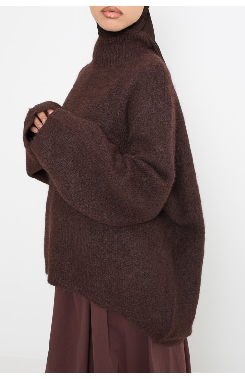 Adoptez ce pull en maille oversize au tissu chaud et doux, idéal pour la saison froide. Sa coupe ample assure un confort absolu, tandis que son design asymétrique apporte une touche moderne et tendance : le devant est légèrement plus court que l’arrière pour un effet stylé et décontracté. Col montant.