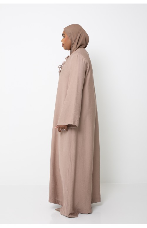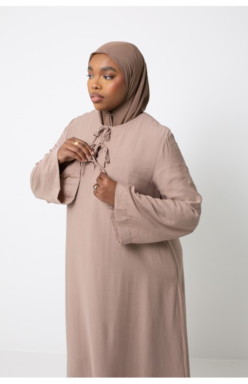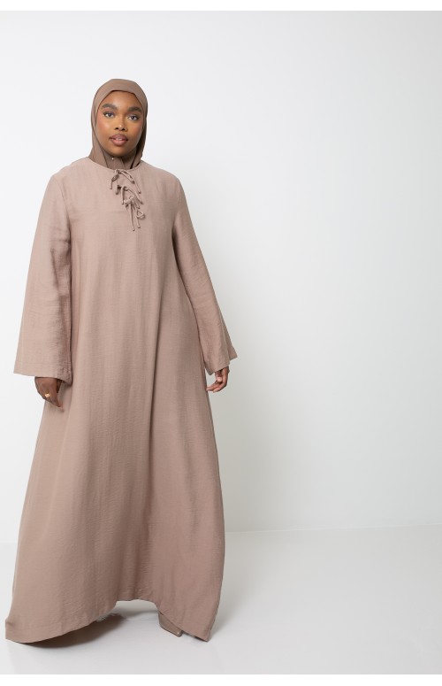 Le modèle mesure 1m71 et porte du M/L pour un 40 habituel. Zaharia porte des talons et le hijab luxe mousseline espresso.